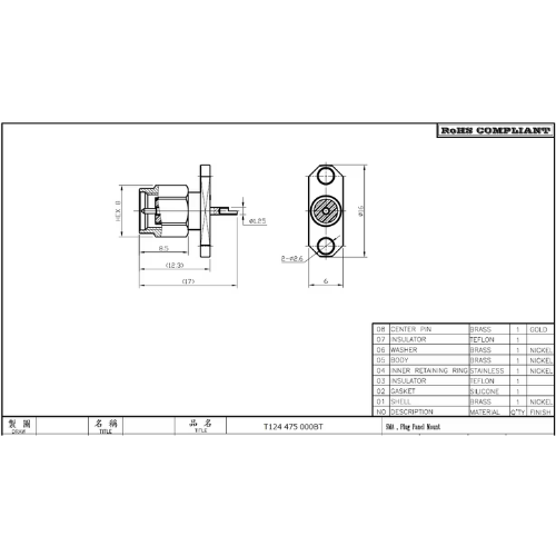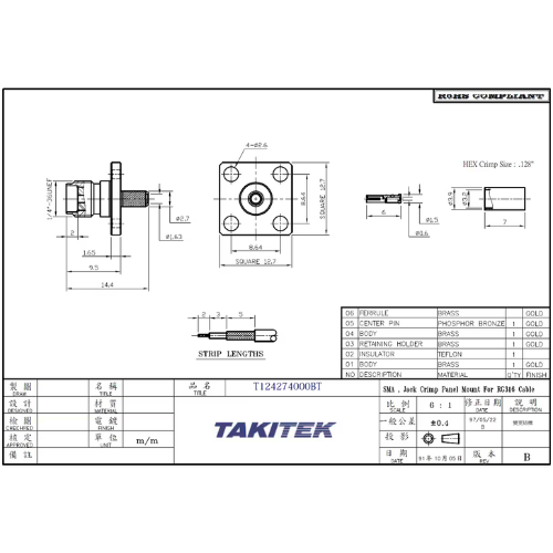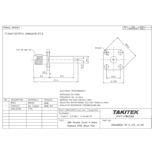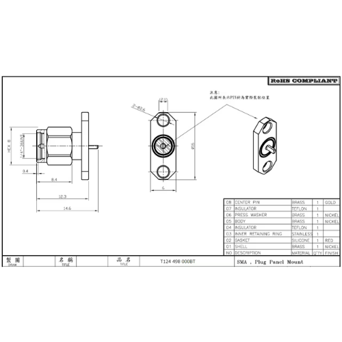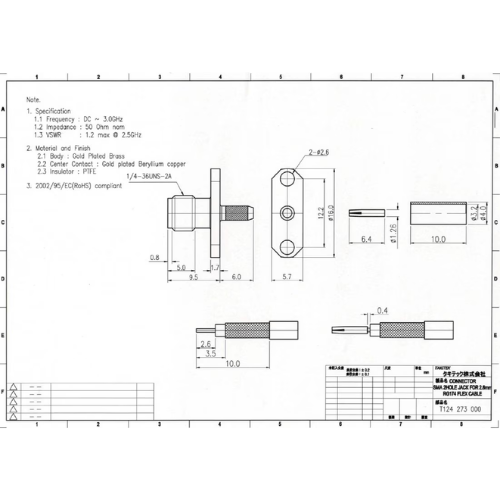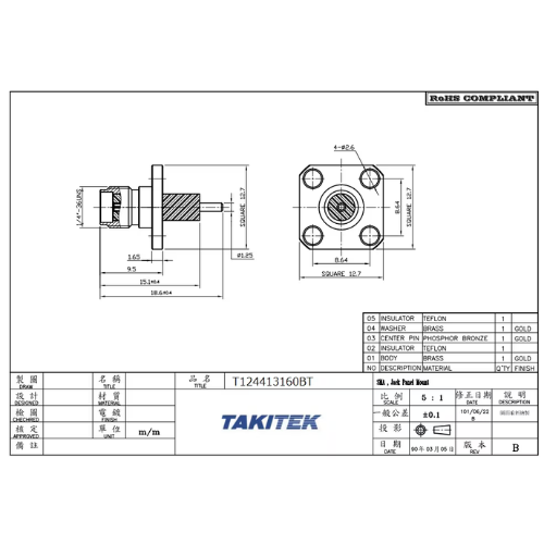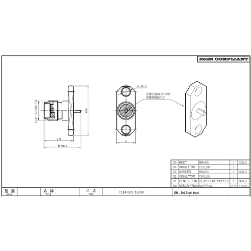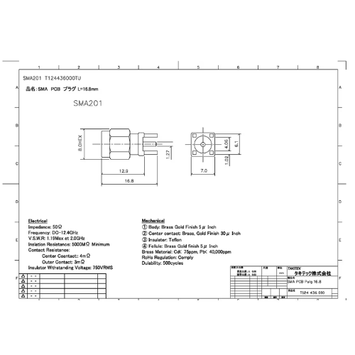 T124436000 SMA PCB ライトアングル ジャック 全長16.8mm